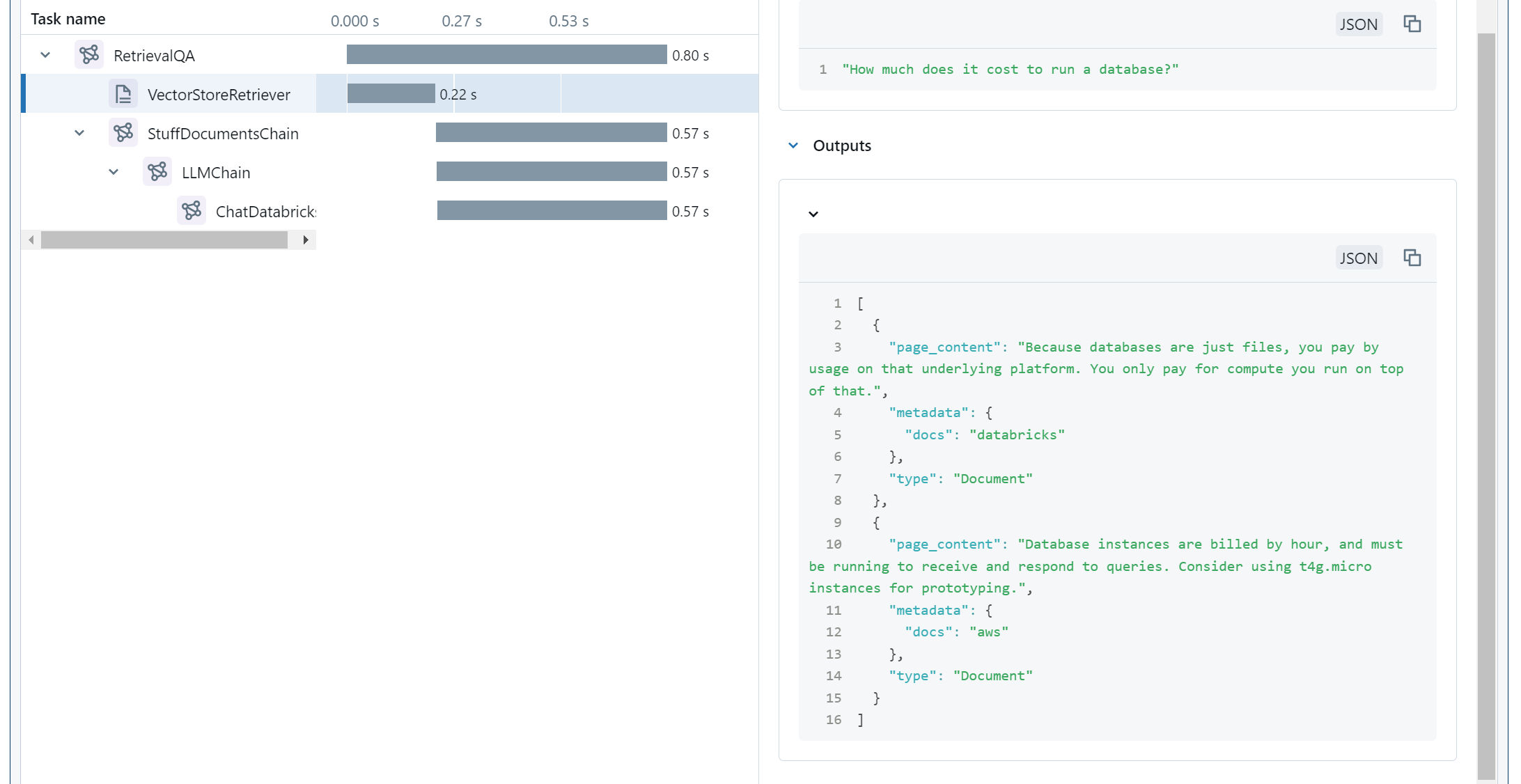 When we run this, MLFlow Tracing tracks how all the components of our chain invoke each other, and what their inputs and outputs are. It stores this data in a resilient location, but also conveniently displays it right away for us.